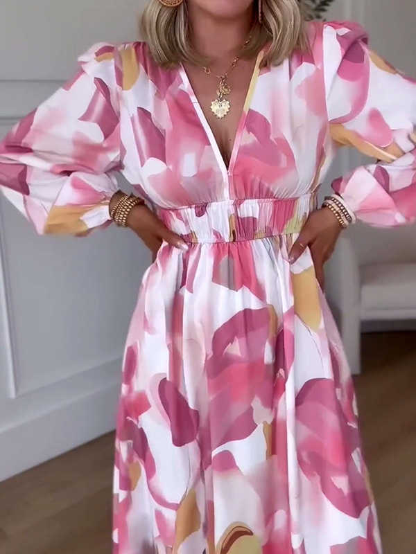 Timeless Elegance: Long Sleeve Printed Elastic Waist Dress